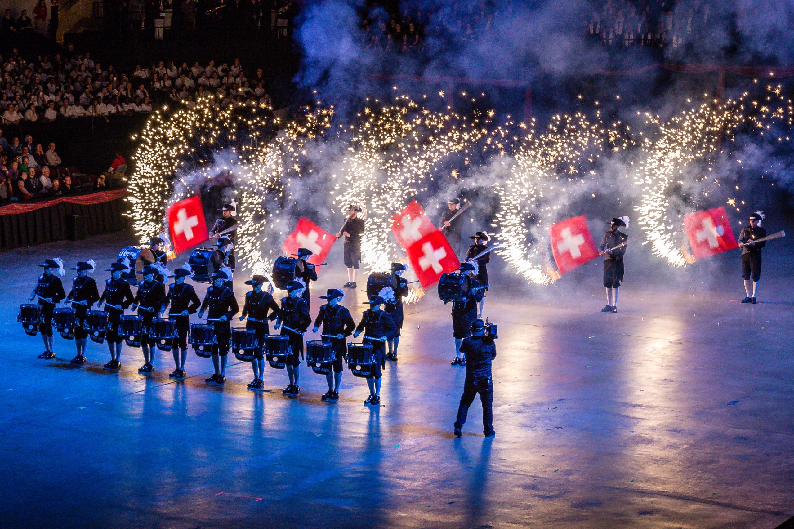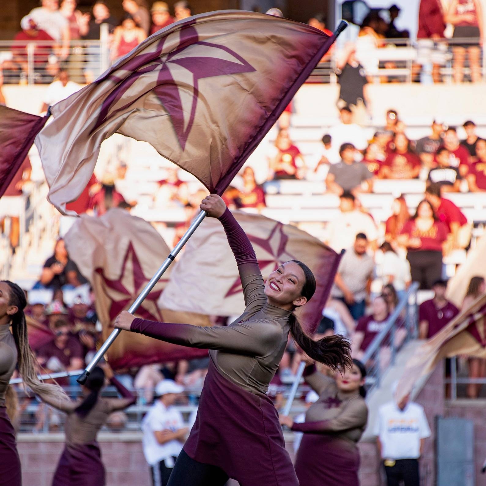 The flag spinning circle is a visually stunning display of coordination and precision. Performers move in sync, spinning and twirling flags in intricate patterns and formations. The circle can include a variety of flag techniques, such as tosses, spins, and catches, all choreographed to music and performed with precision timing.
