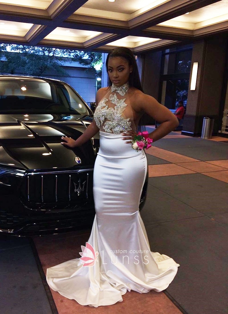 Silver Beading Bodice Ivory Satin Mermaid Prom Dress Lunss
