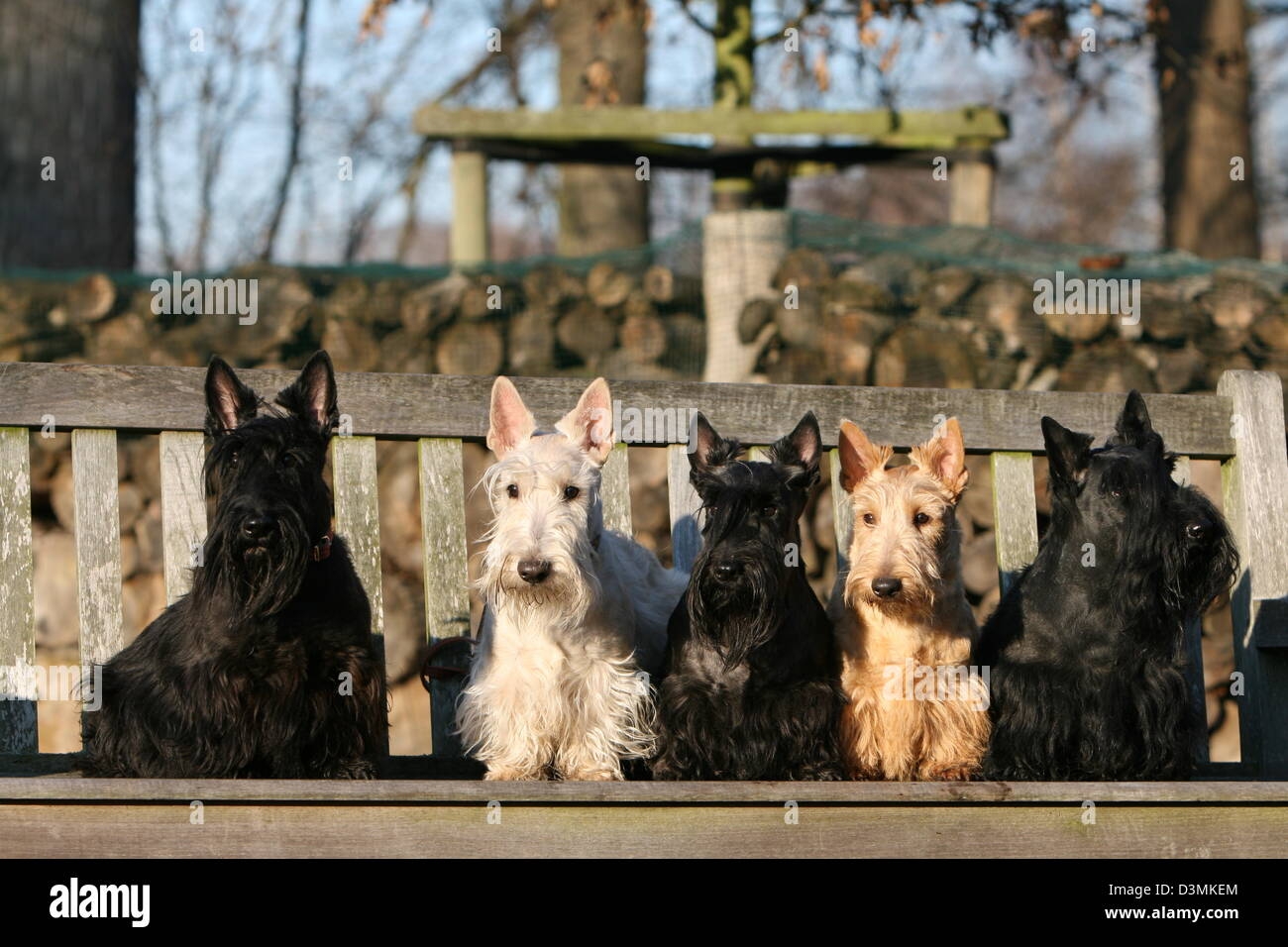 Dog Scottish Terrier Scottie Five Adults Different Colors Sitting On A Bench Stock Photo Alamy